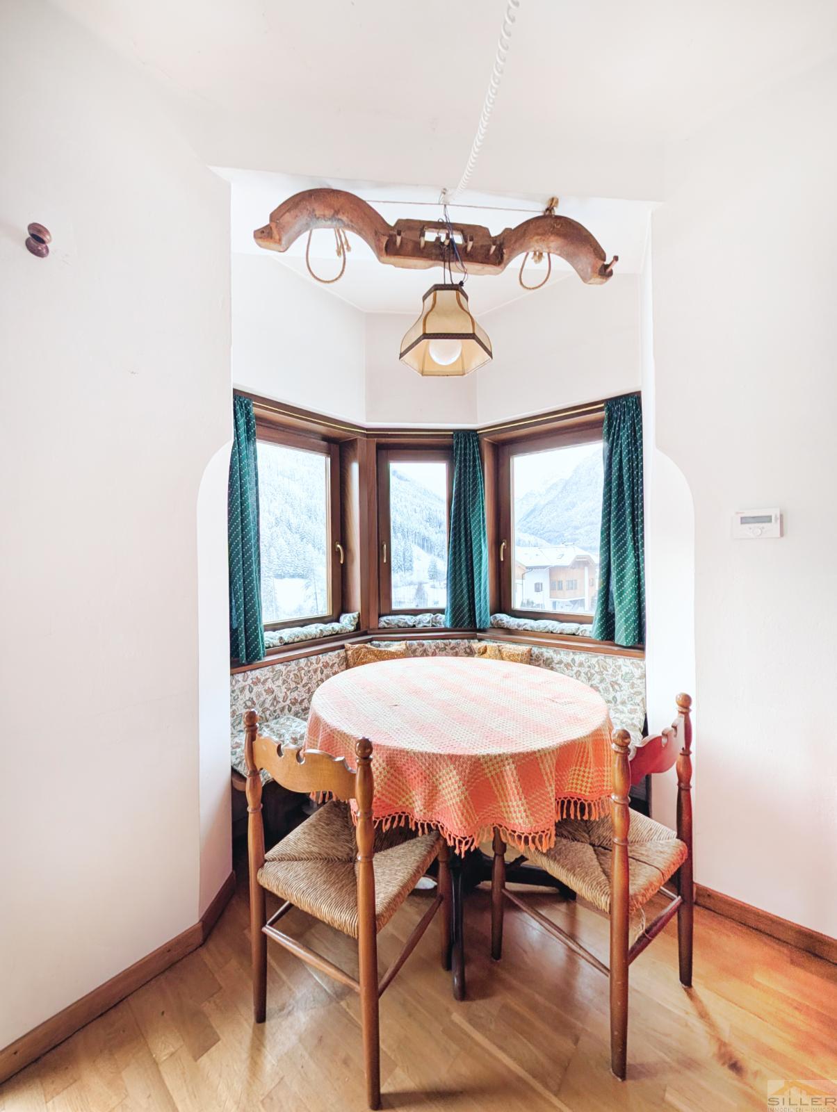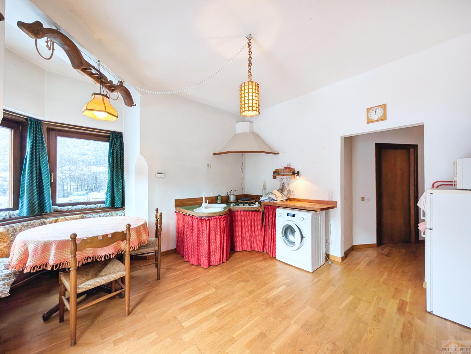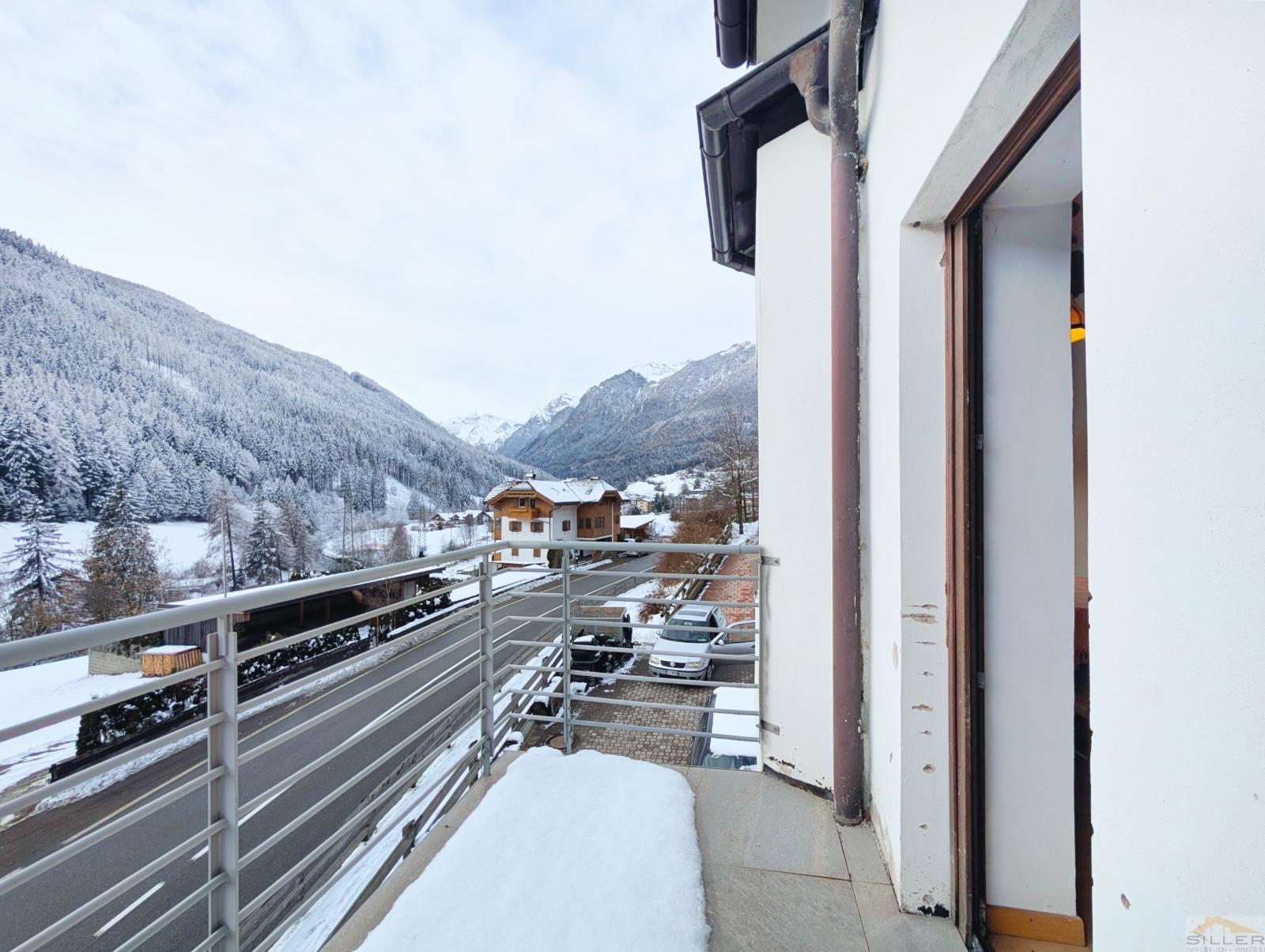 It features one bedroom, a bright eat-in kitchen, and a bathroom. From the west-facing balcony, you can enjoy a spectacular view of the Pflersch Valley, which is undoubtedly one of the property’s greatest highlights.
