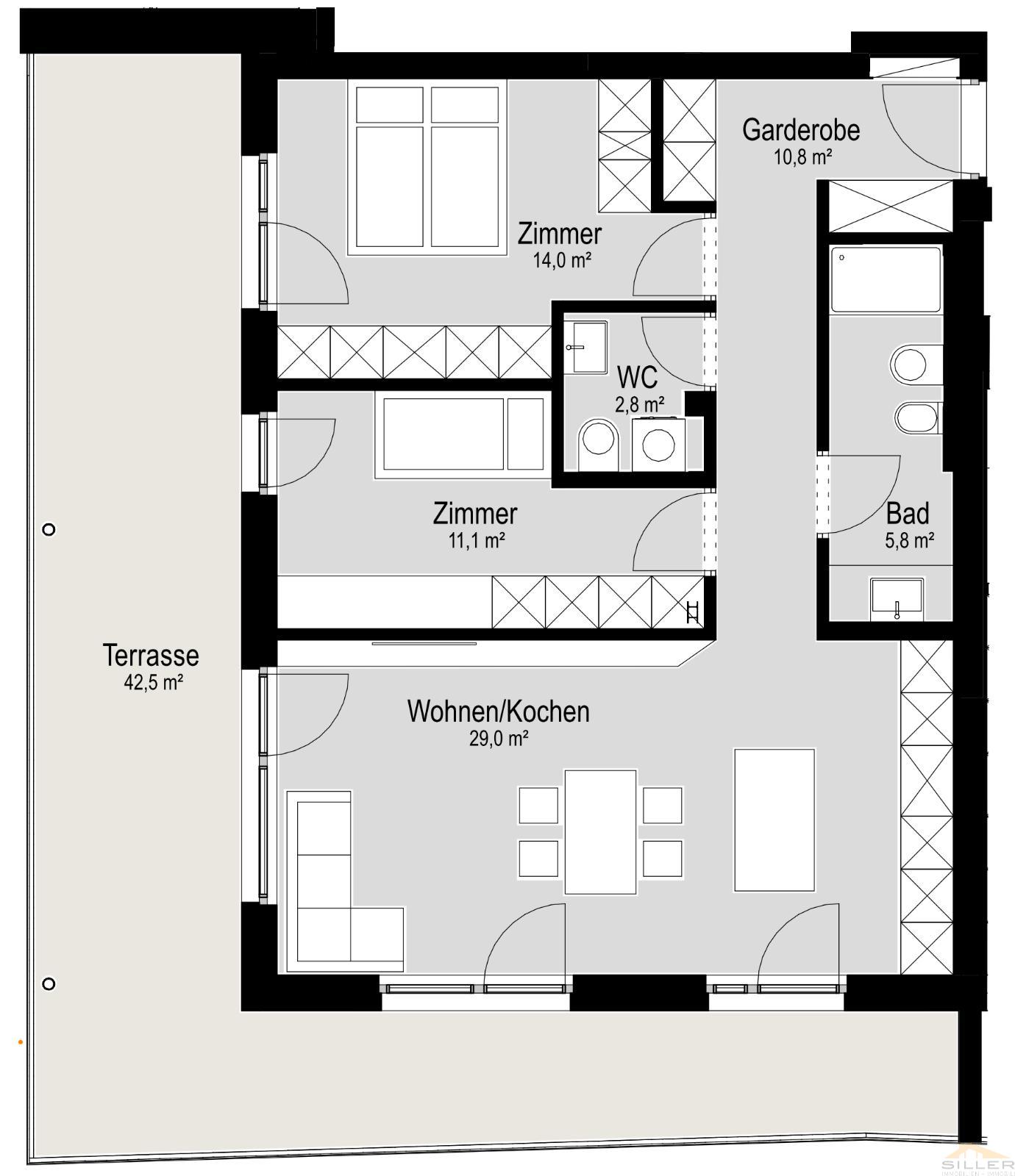 A 3-room apartment on the top floor with a 42.5 m² southwest terrace and direct mountain views. The new construction project "Garbe" combines modern architecture with well-thought-out functionality and offers living quality at the highest level.